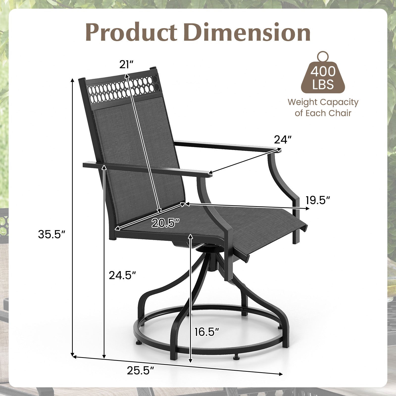 These elegantly designed patio chairs feature a 360-degree swivel for seamless conversation, complemented by a sturdy metal frame for lasting durability. In addition, the outdoor dining chairs’quick-drying and breathable fabric ensures comfort and ease of maintenance, while the contoured seats provide ergonomic support for those long, leisurely meals. Swivel Convenience: The 360°swivel motion endows these patio dining chairs with great convenience, which allows you to effortlessly turn in any direction to join any conversation or simply find the perfect angle for sunbathing. High-quality Fabric:The premium fabric of these patio chairs is quick-drying and wear-resistant for better outdoor performance and longevity. Moreover, the fabric also provides you with a breathable sitting experience. Optimal Comfort: Featuring ergonomic backrests and contoured seats, these outdoor chairs are perfectly shaped for your body’s natural curves. Additionally, the armrests bring added comfort. Sturdy Construction:Each patio swivel chair is constructed of heavy-duty metal frame with stable 4-legged structure, which ensures strong loading capacity up to 180 kg for stable and reliable support. Wide Application: Designed with elegant lines and modern silhouette, these outside chairs add a touch of sophistication to your outdoor settings, including porches, lawns, gardens and backyards.