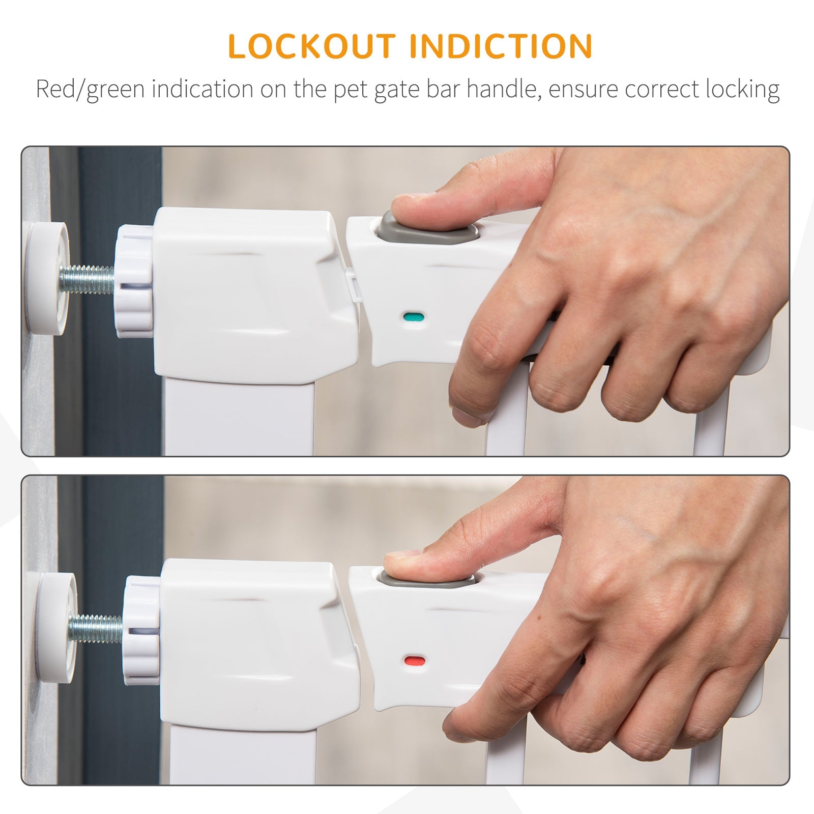 Need to keep pets from certain places? This PawHut pet gate does the job. Made from white-coated steel, the dog stair gate is strong and durable, staying firmly upright when in use. Width is adjustable between 75-82cm for different sized spaces. If the dog barrier is open at less than 90°, it automatically closes and locks – the red and green indicator signals if the door is locked or not. It opens both ways to easily pass through. You'll have peace of mind, knowing pets cannot access forbidden areas.