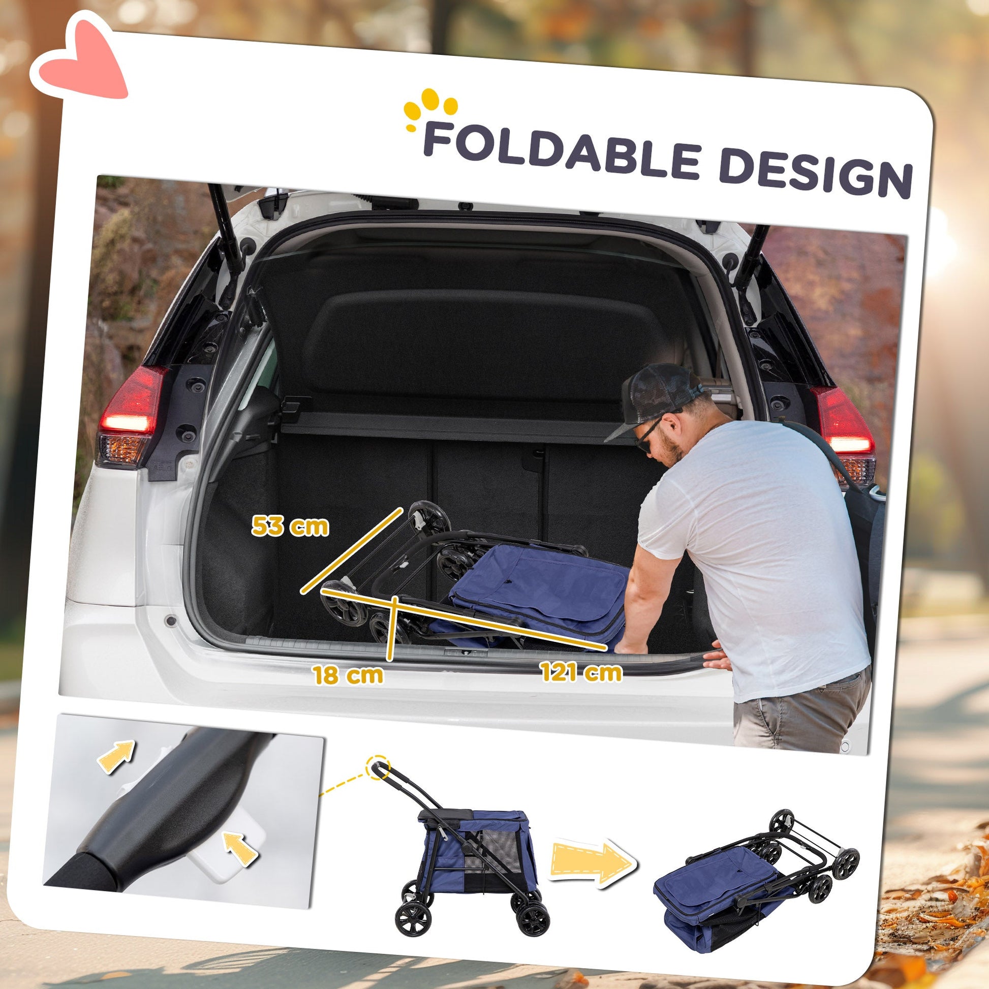 PawHut Dog Pram Dog Stroller 4 Wheels Pet Pushchair with Rolling Door, Cushion, Safety Leashes, for Small and Medium Dogs, Dark Blue