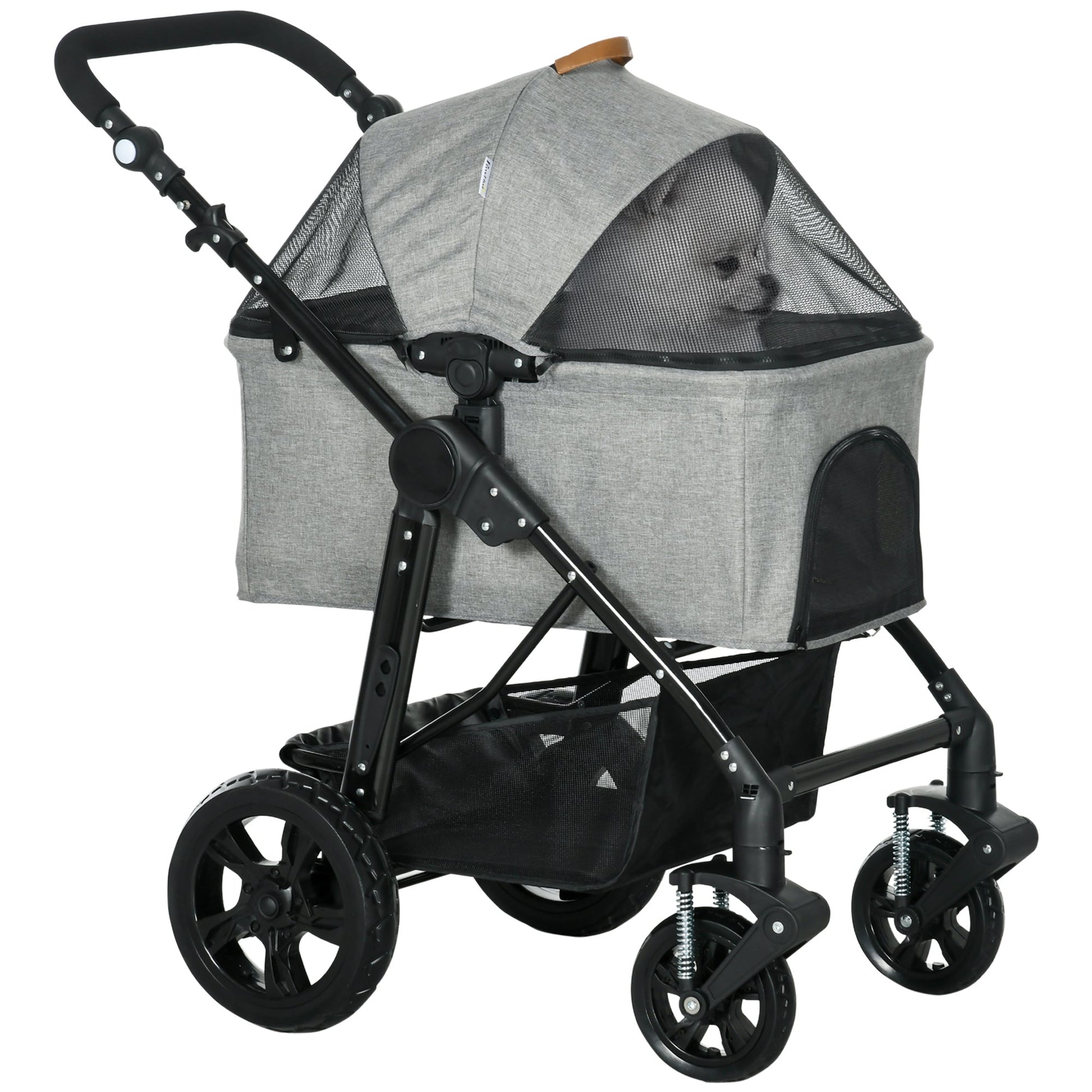 PawHut Dog Pram Pet Stroller for Small Dogs Cats, Foldable Dog Pushchair Trolley with Detachable Pet Carrier Bag, Shock Absorber, Adjustable Handlebar, Grey