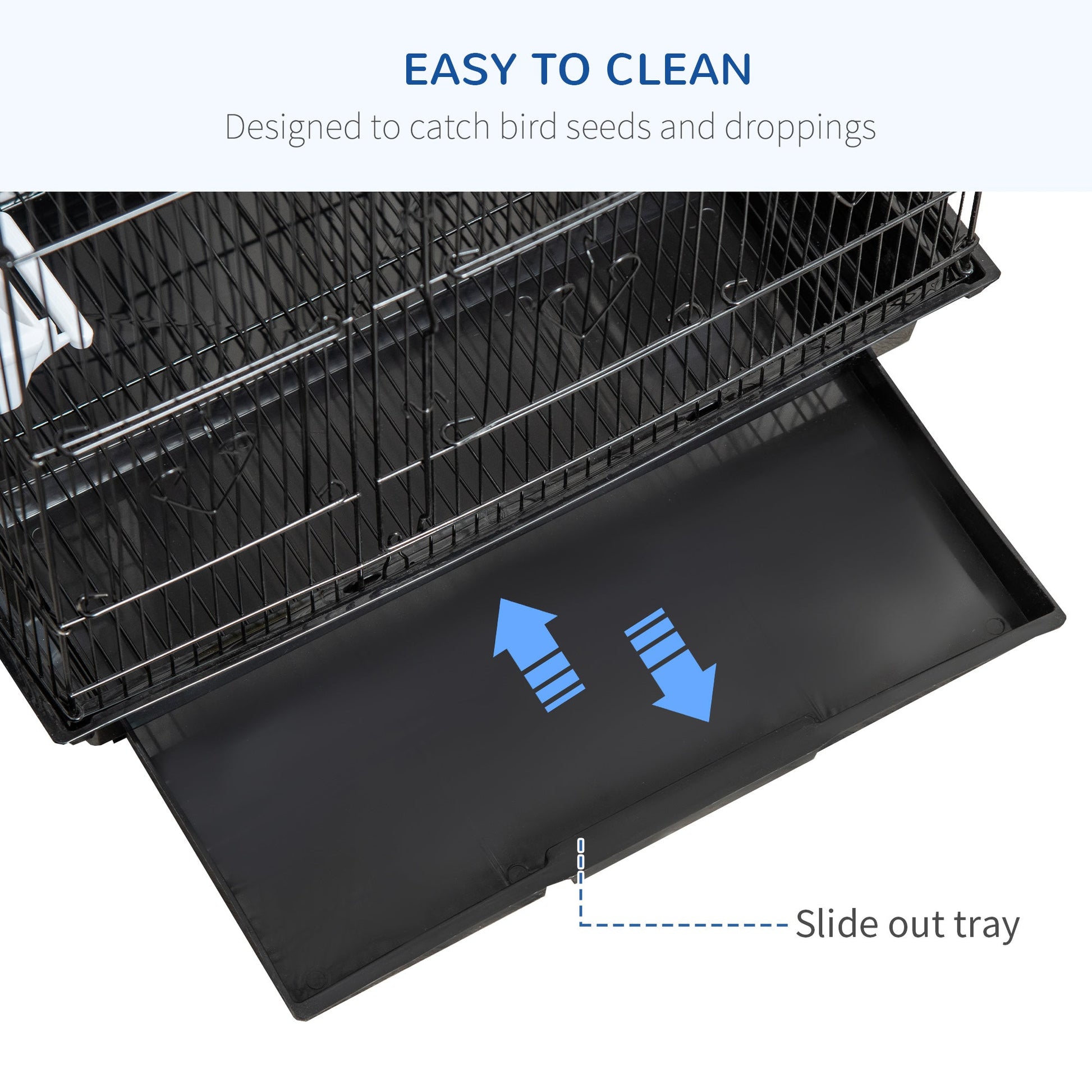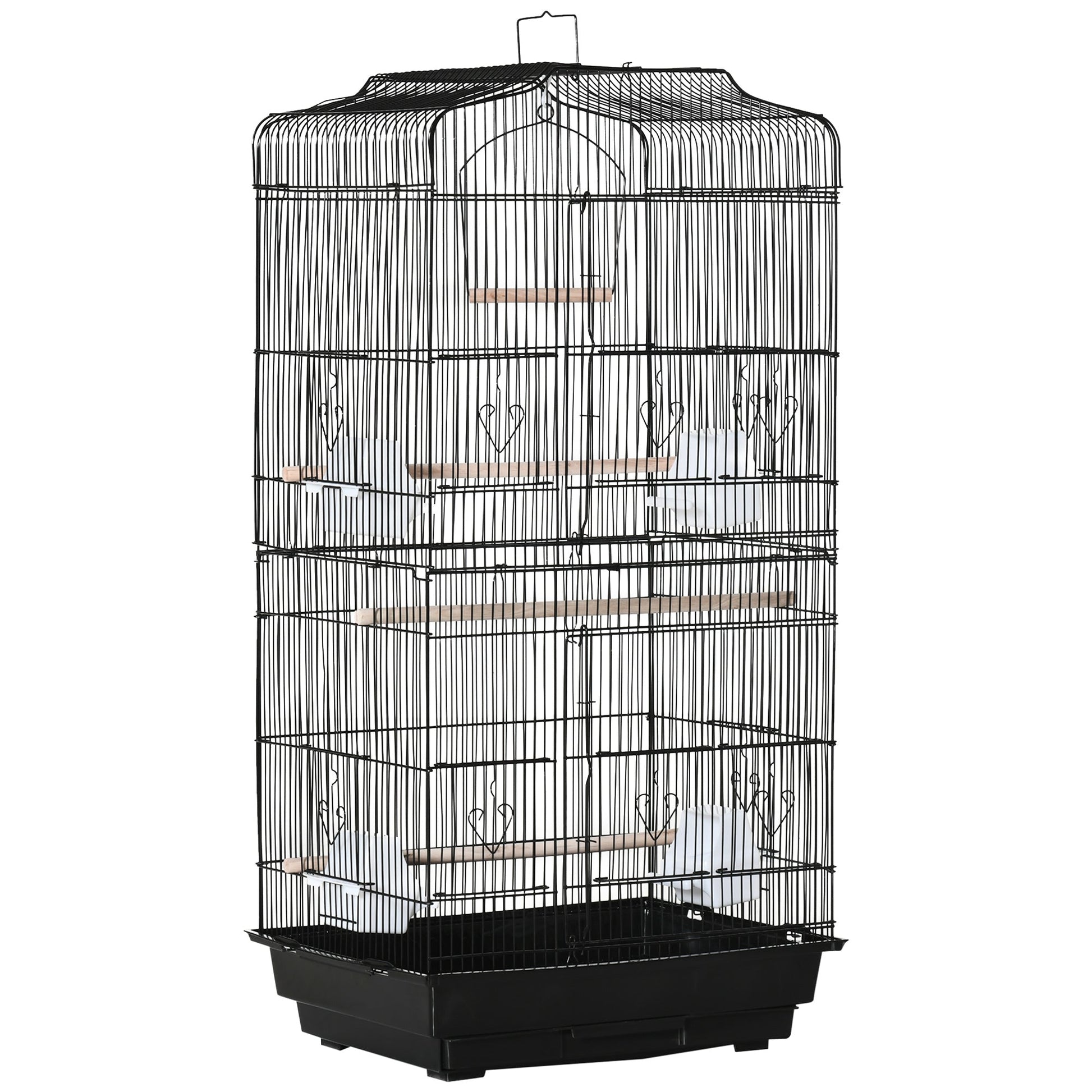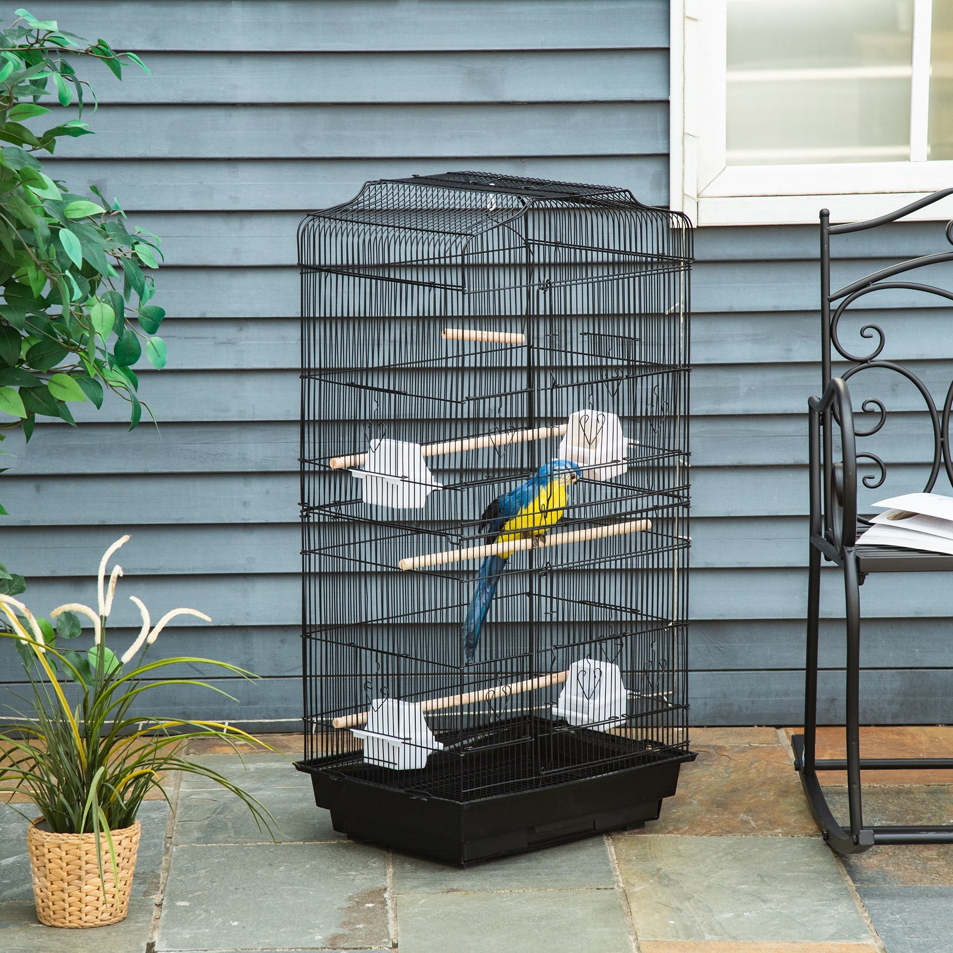 A spacious PawHut bird cage, featuring three wooden perches, four plastic food containers and a swing to provide an entertaining and comfortable home for birds. Two large front doors allow easy access, while the ten small doors enable feeding, cleaning and interaction. The slide-out tray at the bottom makes it easy to clean, keeping the space tidy and comfortable for eating, playing and relaxing.