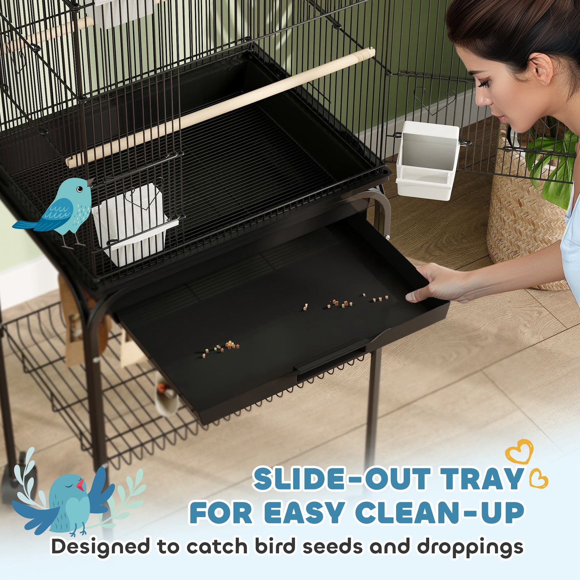 This PawHut bird cage oozes space and comfort, providing your birds with an excellent home to thrive. With two plastic perches, it's great for finches, canaries, budgies and similar birds. It has a large front door, two sliding food doors and rolls effortlessly on four wheels. The bottom shelf keeps supplies close for extra convenience. Enjoy this easy-to-clean cage, featuring a removable tray that can be wiped clean, whilst the bottom net separates droppings for better hygiene.