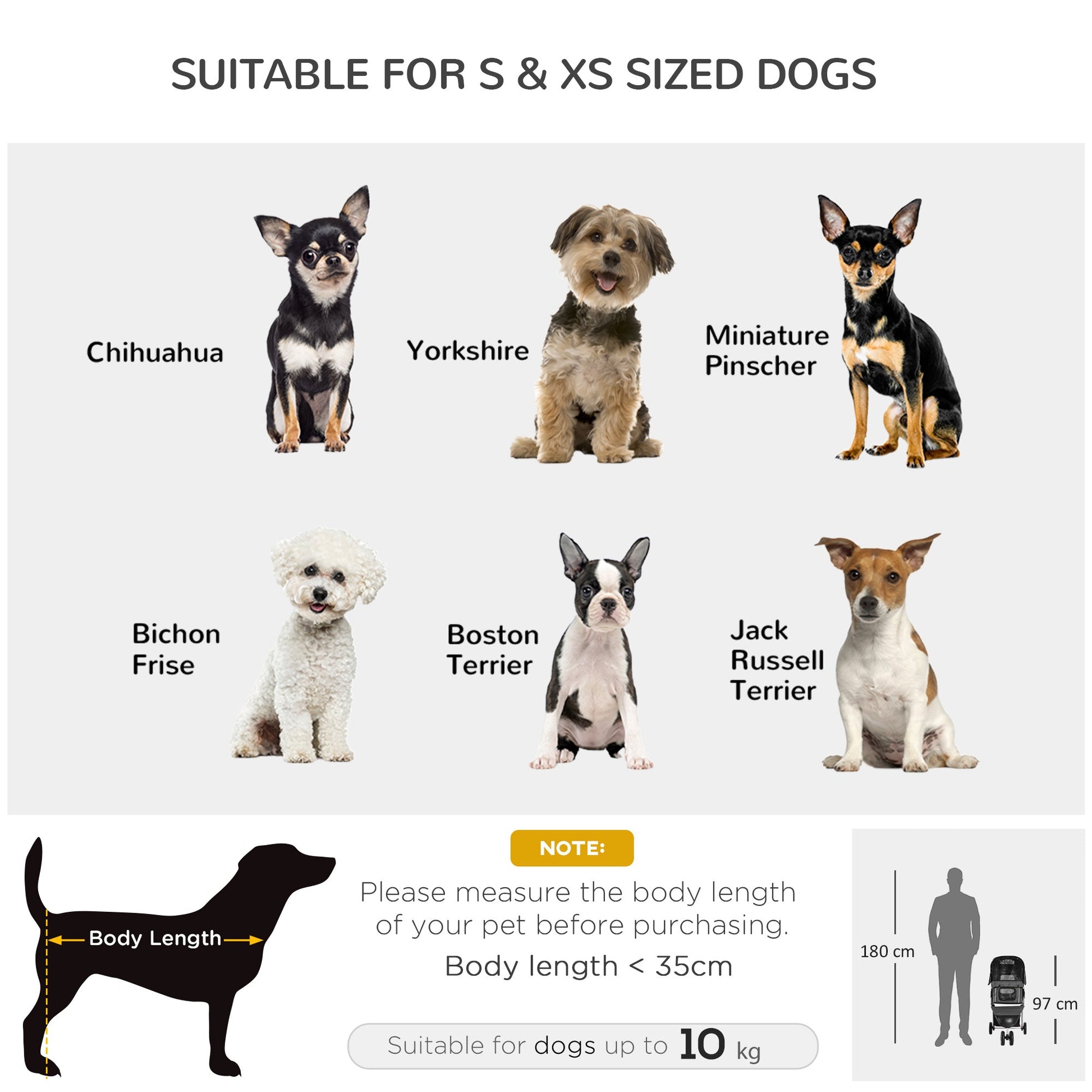 - Suitable for small and miniature dogs less than 35 cm in length and less than 10 kg in weight