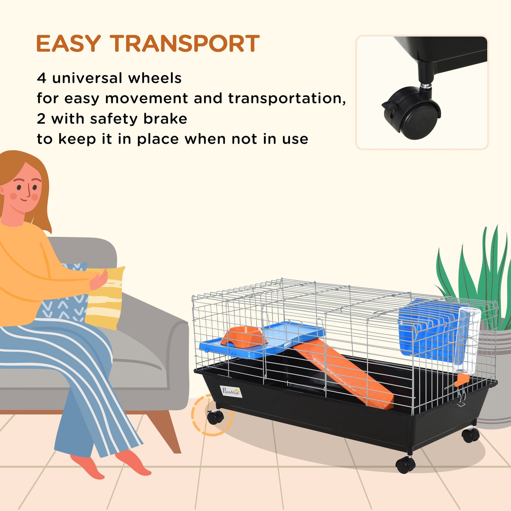 Give your small pet their own place to chill the day away with this cage from PawHut. It's made with a 40x89cm living area, protected by metal wire casing, keeping them safely inside and allowing the air to flow through. Inside features a small platform with a food bowl, a water bottle, a ramp and a hay feeder, giving them everything they need to stay happy, hydrated and fed. With a large front door and top door for easy access, it's finished with a deep base, which collects dirt and debris, and four wheels to move around easily. Perfect for Rats,Chinchillas and more.