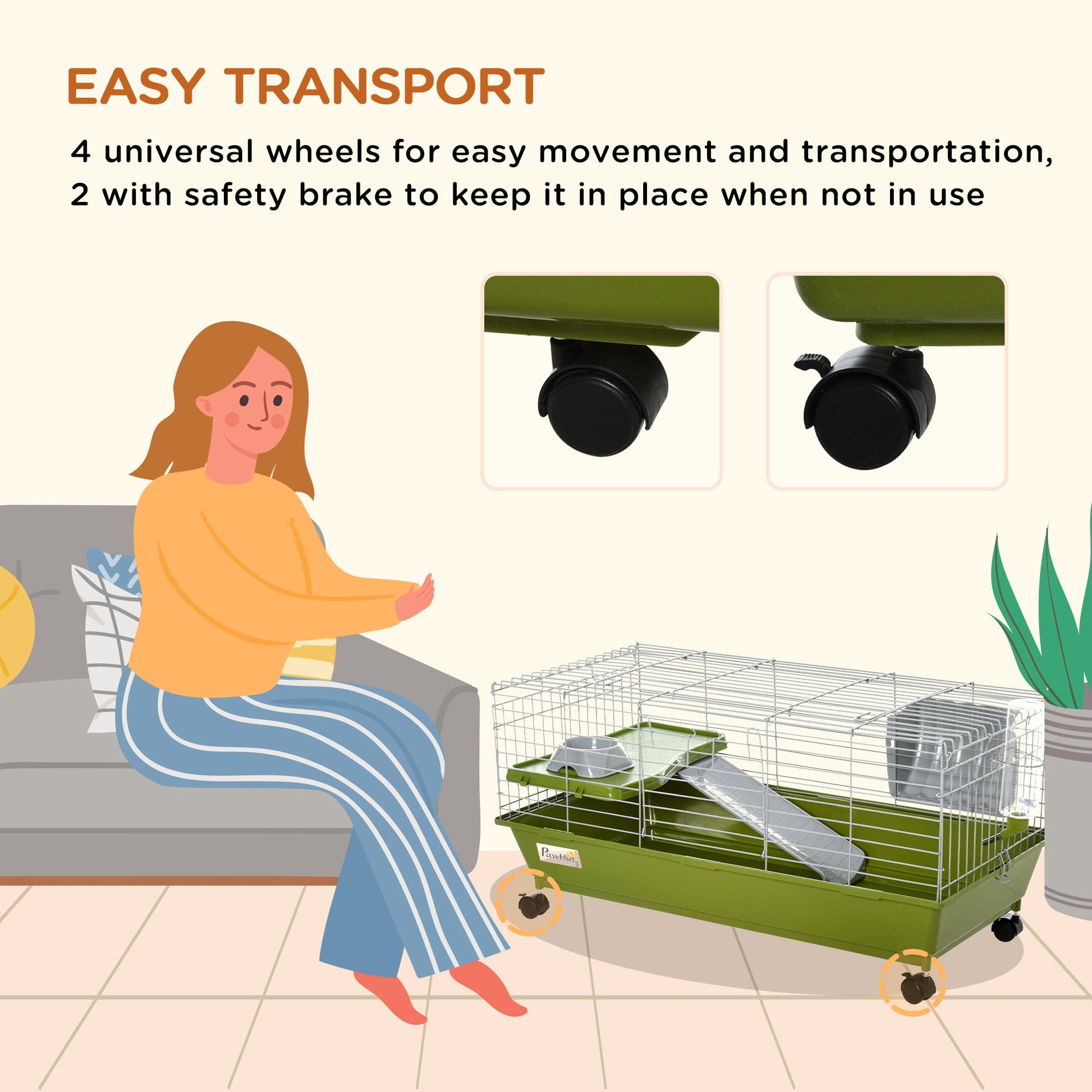 PawHut Small Animal Cage Rabbit Guinea Pigs Chinchillas Cage w/ Wheels Water Bottle Food Dish Platform Ramp 89 x 44 x 43 cm Green