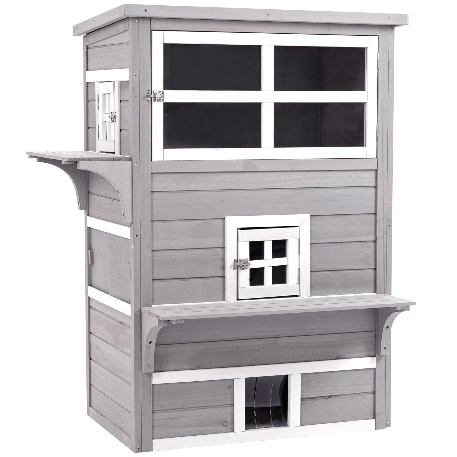 PawHut Three-Tier wooden Kitten Shelter, Outdoor Cat House, with Jumping Platforms, Asphalt Roof, Doors - Grey