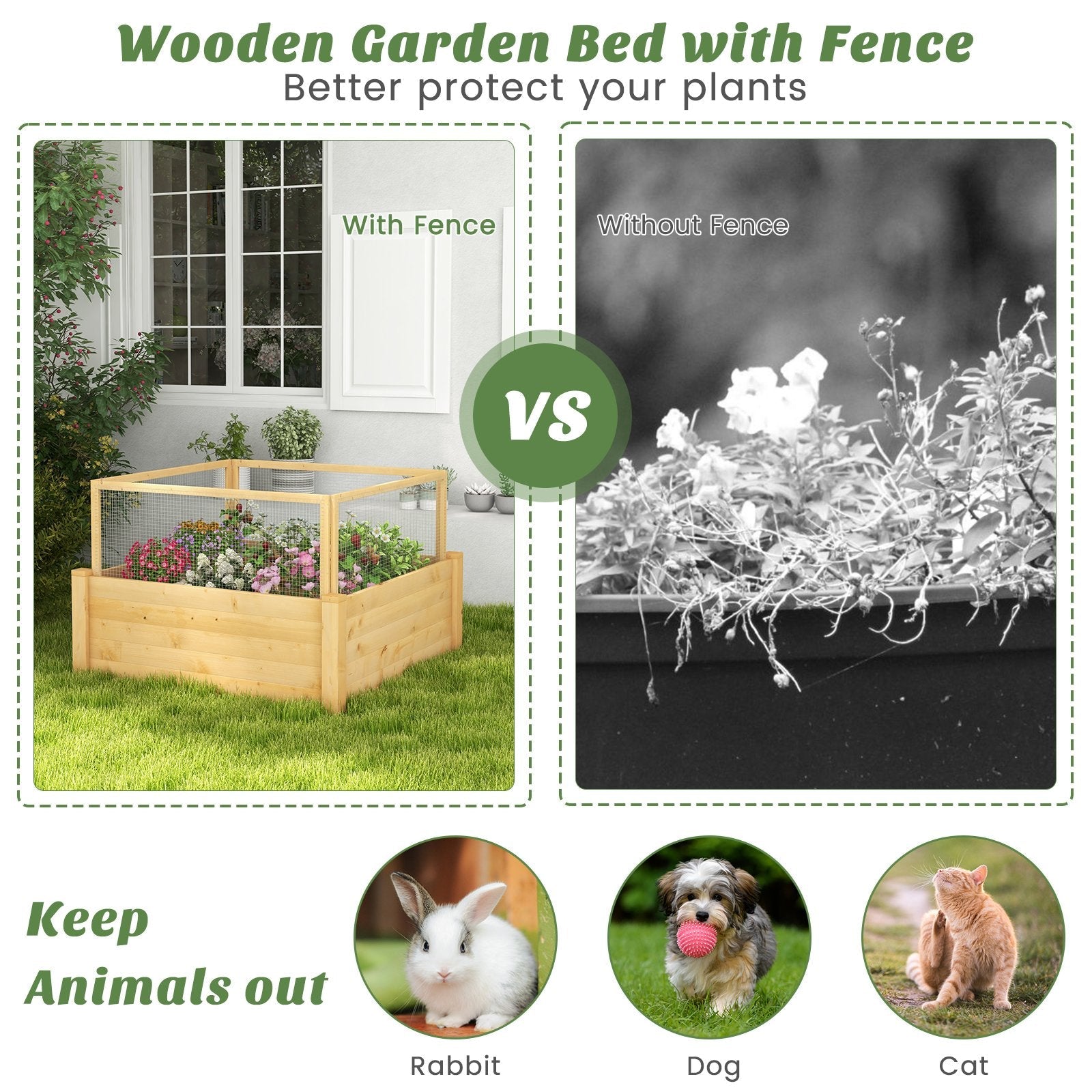 Time to pick the ideal planting bed for ythe favorite plants! This wooden raised garden bed with fence will effectively protect ythe plants from critters. In addition, this planter bed offers a 9-grid shelf to divide growing space. The 9 planting area is suitable for different kinds of plants. Or, you can remove the grid for bigger space. The 95 cm x 95 cm x 37 cm elevated planter box protected creates ample space for plants to fltheish. Besides, the open-ended base enables excessive water drain out quickly. Made of high quality fir wood and comes with reinforced crossbars, this garden bed is super sturdy. In addition, the painted surface is water resistant to ensure long-lasting use. Therefore, this garden bed is a good choice for decorating gardens, balconies and patios. Equipped with clear instructions, installation is a easy thing for you! Natural Fir Wood Frame: Crafted from natural fir wood, the garden bed features excellent performance to resist crack and deform. And the wooden surface is painted to ensure long lifespan. Besides, constructed of thick boards and reinforced by crossbars, the garden bed is ultra stable. Customizable Planting Area: Equipped with a detachable 9-grid shelf, the wooden raised garden bed allows you to adjust the planting space by ythe preference. If the 9 grid shelf is assembled, 9 planting area is divided to grow different vegetables, fruits, flowers, herbs. Or you can remove the shelf to create a bigger planting space. Multipurpose Garden Fence: The 4 critter guard fence will protect ythe plants from the damage of rabbit, dog, and cat. In addition, it can provide support for vine growth and keep ythe plants growing upright to some extent. Coming with sharp end, the fence can be fixed 10 cm deep into the soil to keep stability. Open-Ended Base Design: Benefiting from clever open-ended base, the excess water will be drained out easily, thus the root of plants can healthily grow. Meanwhile, it will remain soil nutrients and increase air circulation to create ideal environment for plants. Easy Assembly and Wide Usage: Comes with complete accessories and detailed instruction, the raised garden bed can be quickly installed. Then you will get a nice addition to bring nature and greenery to ythe living area, such as ythe garden, porch, yard, balcony.
