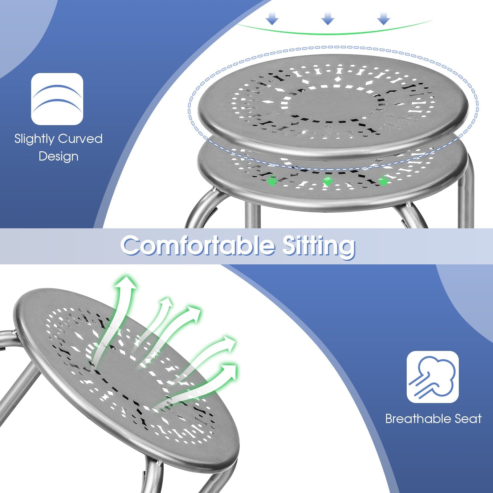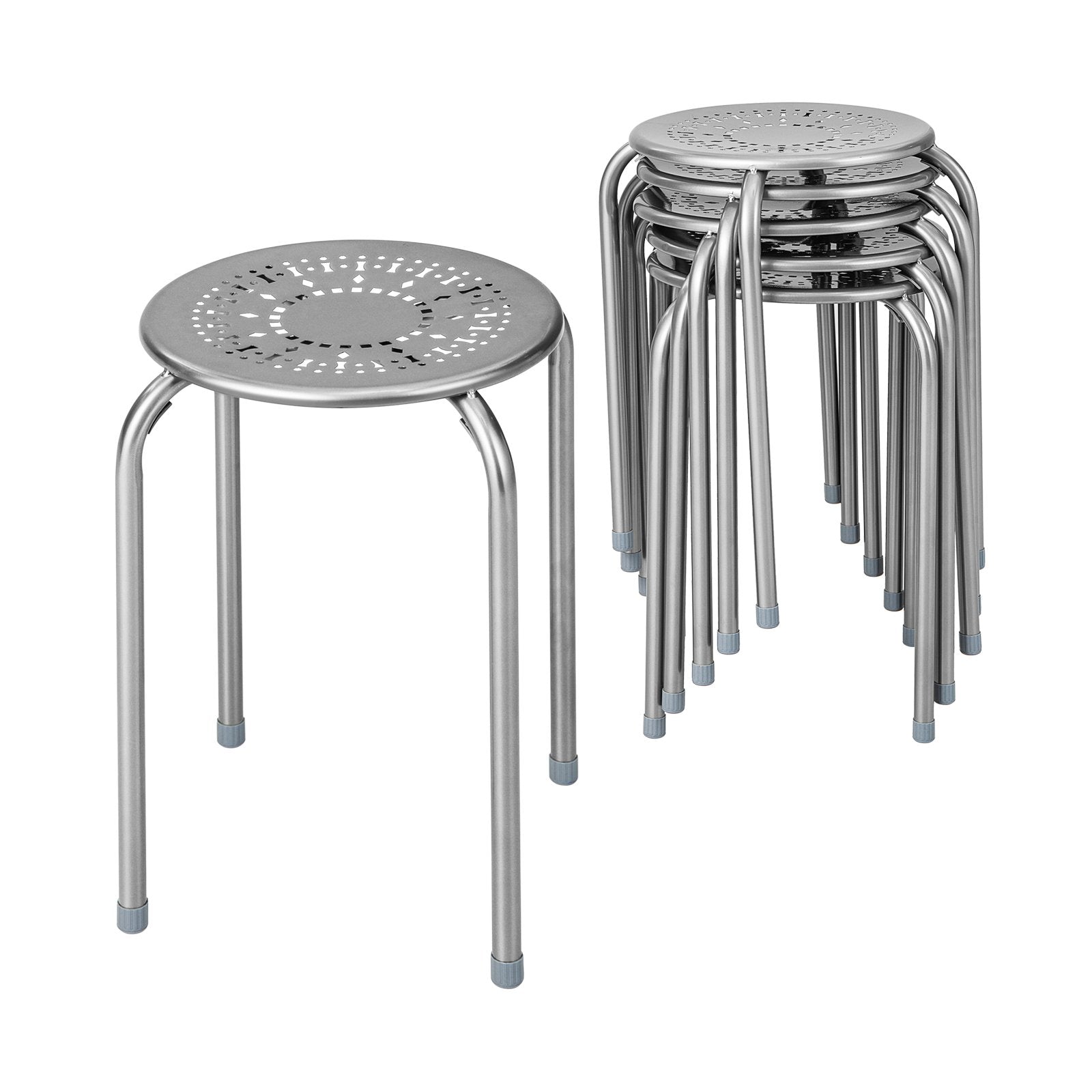 Measures 30 cm in diameter, this metal stool's seat top provides a wide surface for comfortable sitting. With the stackable design, these stools won't take up much storage space. In addition, each stool has a hollow patterned seat surface for both ventilation and decorative purposes. Apart from that, crafted from plastic-coated metal, these stools feature high resistance to water and rust which is ideal for outdoor use. what's more, the X-shaped structure can easily hold up 80 kg of weight for daily use. In one word, these stack stools will be your ideal companion for home, office, school, etc. If you are looking for a Set of 6 Round Metal Stools like this, do not hesitate to place an order! High-Quality Metal: Crafted from a high-quality metal tube, this round stool is characterized by high sturdiness. In addition, the painted metal pipe features high resistance to water and rest, which guarantees long service life. Sturdy Construction: Supported with an X-shaped structure, this sturdy stool features a high load capacity of 80 kg. Additionally, the non-slip base prevents scratches to the floor, and adds extra safety to the whole structure. Stackable Design: Designed with a simple stackable structure, this set of 6 stools can be stored in a compact size when not in use, which will save you a lot of time and effort to organize them. For instance, it is especially suitable for crowded place such as classroom or party. Nice Patterns for Various Places: Fitted with attractive and beautiful patterns, this simple style stool will blend in easily with any indoor or outdoor decoration. In addition, the hollow-out seat surface also has a ventilation function to keep you cool on summer days. No Assembly: With no assembly steps required, this stool set will save you a lot of effort and time. Just take the stool out of the box for convenient use whenever you want. Apart from that, the stool surface is easy to clean with a damp towel.
