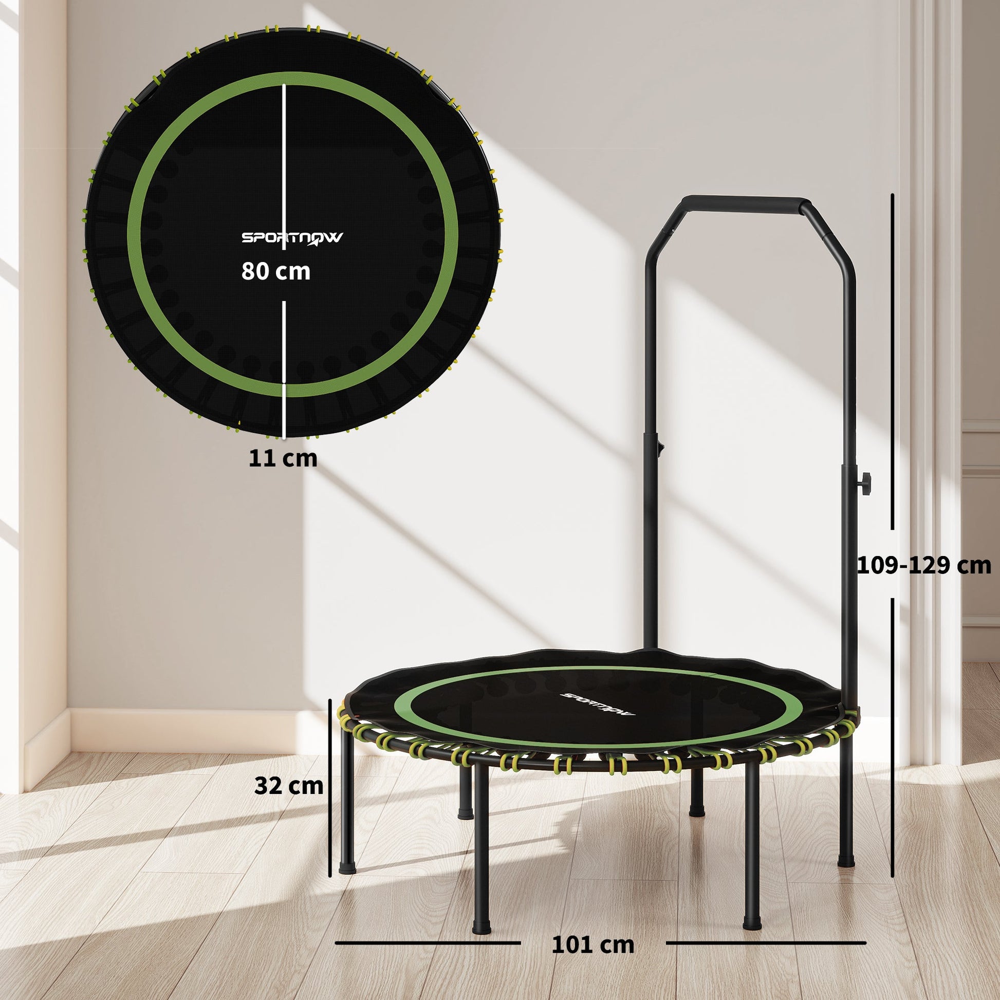 Stay active at home with the SPORTNOW mini trampoline, great for small spaces. Its five-level adjustable handrail offers balance and confidence, especially for beginners. Enjoy joint-friendly bouncing with 28 high-elasticity bungee cords. When done, fold it flat for easy storage. Amazing for home workouts!