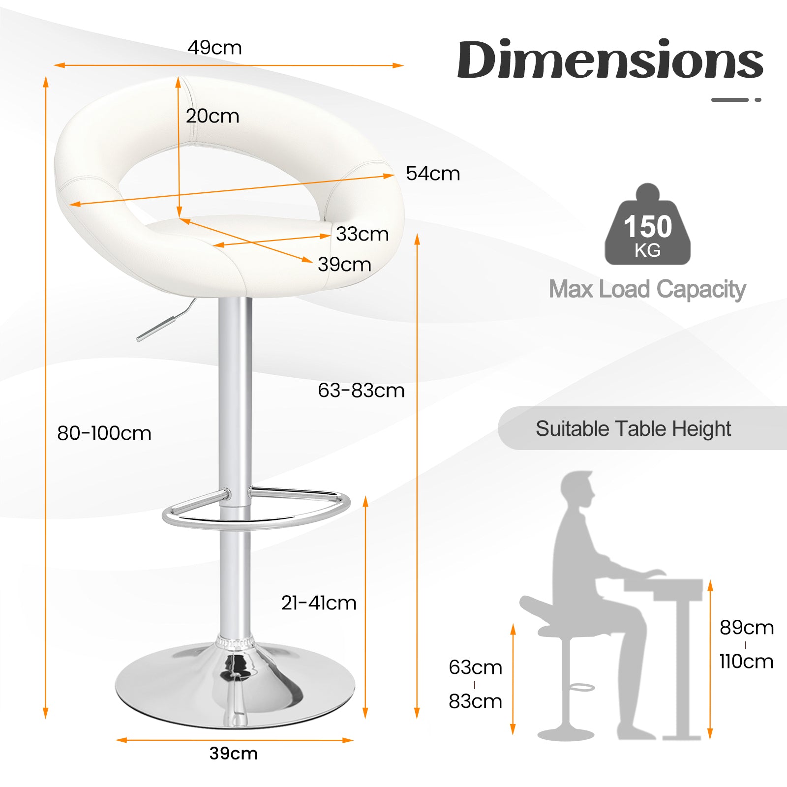 Color: White + Silver/Black + Silver Material: PU, Sponge, Metal Overall Dimensions: 54 x 49 x 80-100 cm (L x W x H) Seat Height: 63-83 cm Seat Dimensions: 33 x 39 cm (W x D) Back Height from Seat: 20 cm Footrest Height: 21-41 cm Base Diameter: 38.5 cm Weight Capacity: 150 kg Net Weight of 2 Stools: 12.5 kg Box Qty:1(May vary by batch)