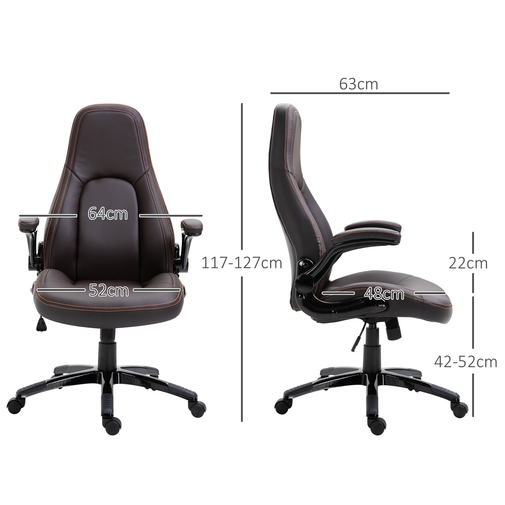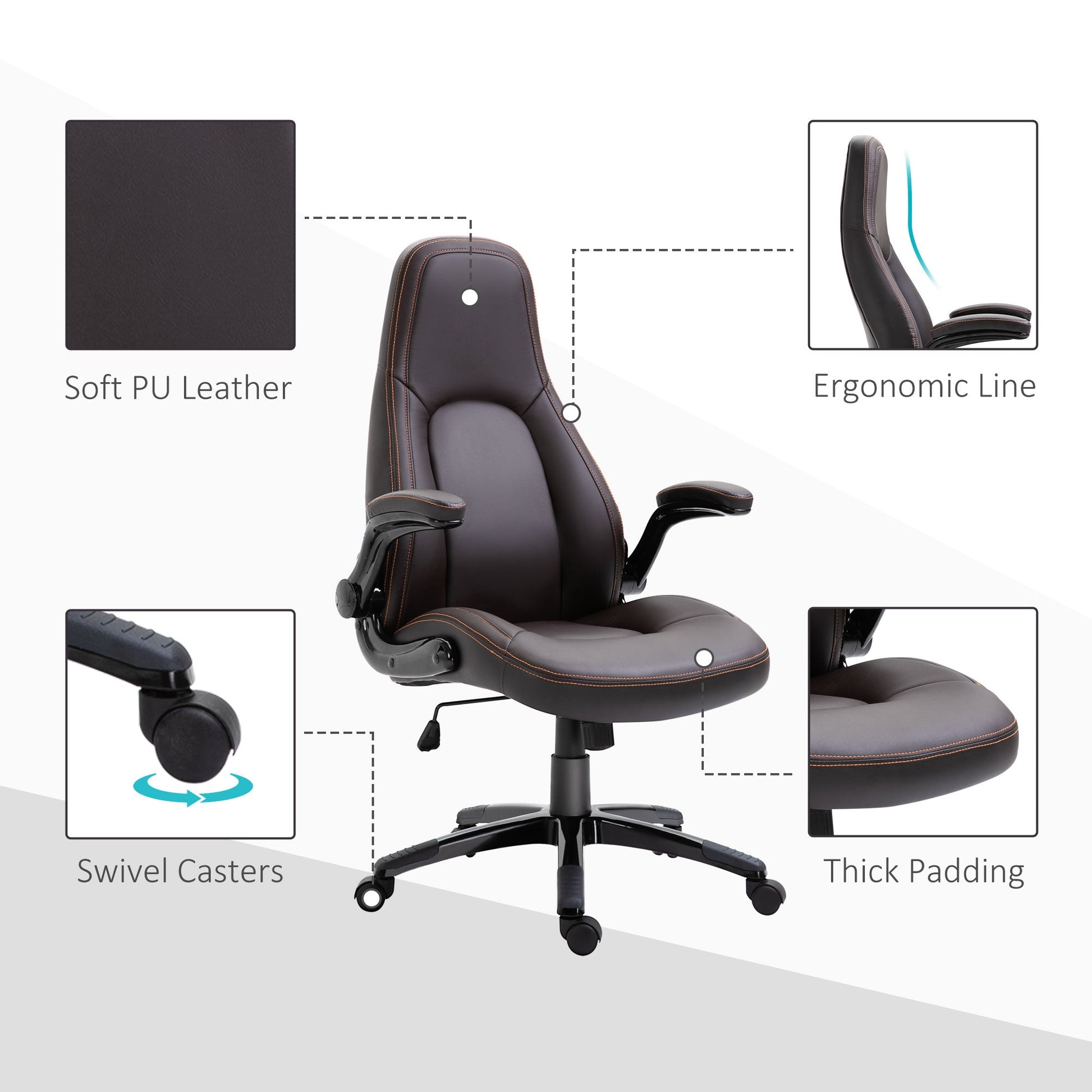 Blending style, comfort, and practicality into your home office with our high back office chair from Vinsetto. The comfy chair is built into a rounded edge style design, and features a high back, flip-up arms, and thick padding to ensure you'll sit comfortably with correct support on your body. Wrapped in PU leather with coffee-coloured stitching on the seams for a stylish appeal. This swivel chair is finished with an adjustable height, 360 swivel base, and five castors to move around easily.