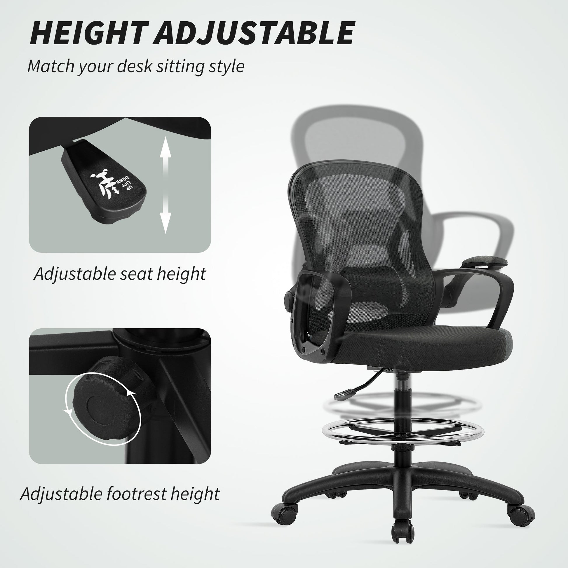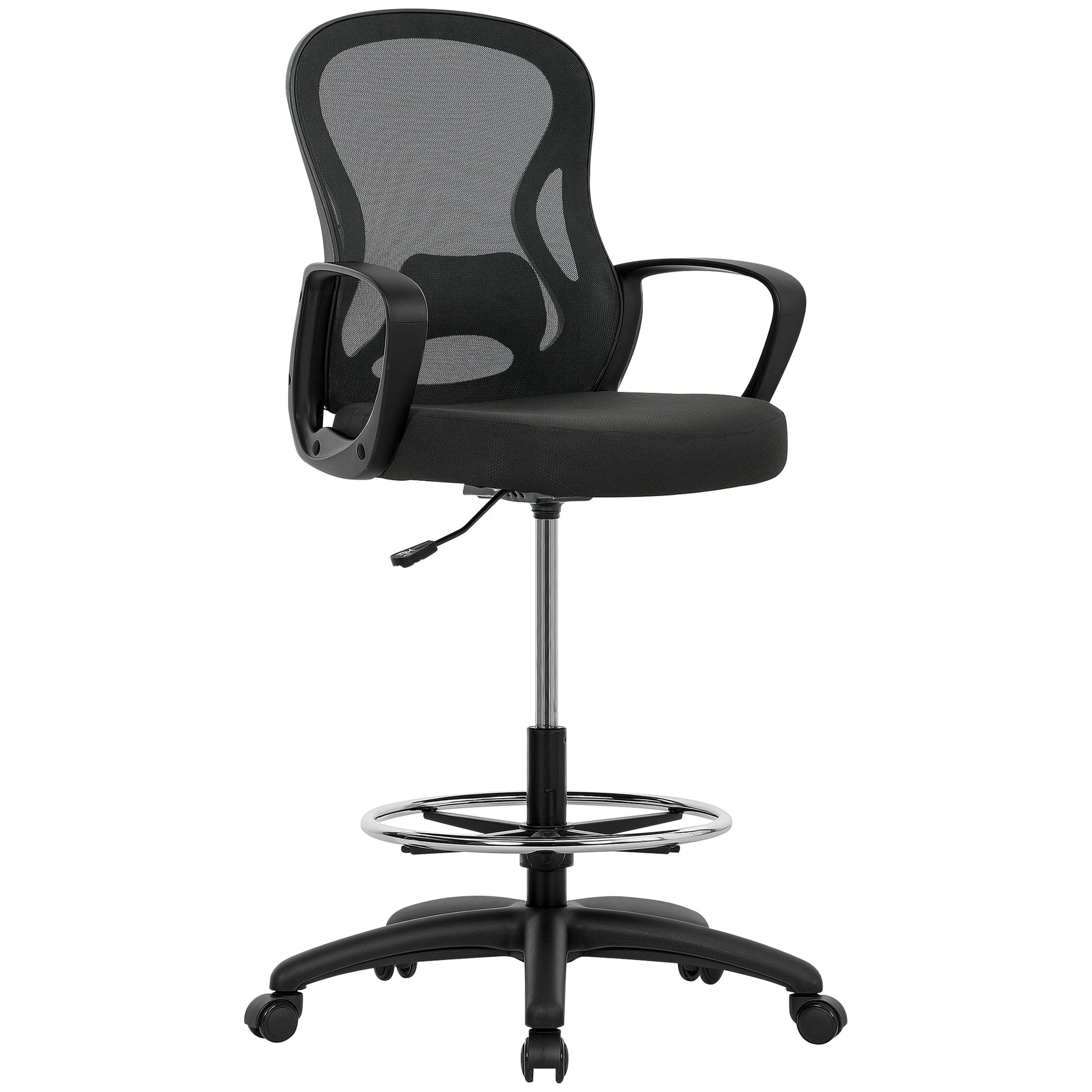 Vinsetto Drafting Chair with Adjustable Footrest, Ergonomic Mesh Office Chair with Lumbar Support, Adjustable Height for Standing Desk, Black