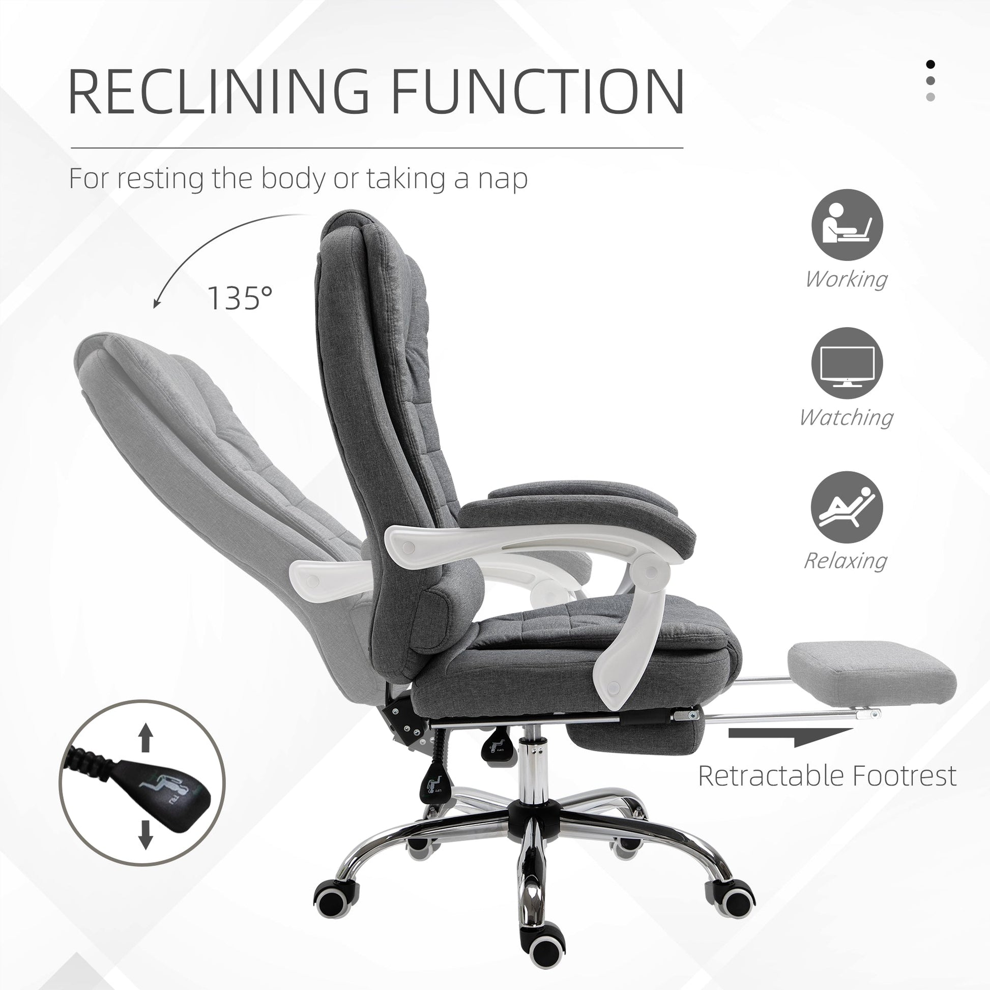 Vinsetto Office Chair, Computer Desk Chair, Linen Fabric Swivel Rolling Task Chair with Large Soft Padded Cushion, 135 Reclining Backrest and Retractable Footrest, Grey
