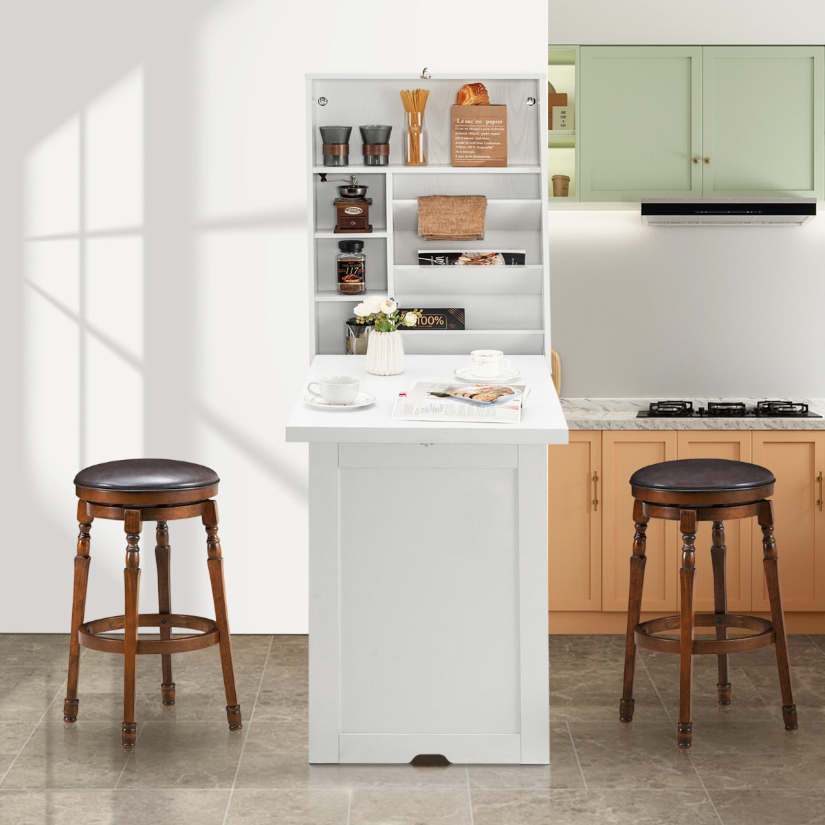 Wall Mounted Desk with 3-tier Tilt Storage Partition and Adjustable Shelves-White