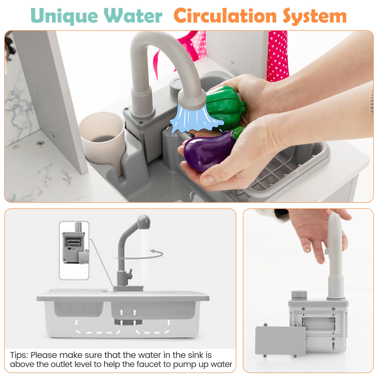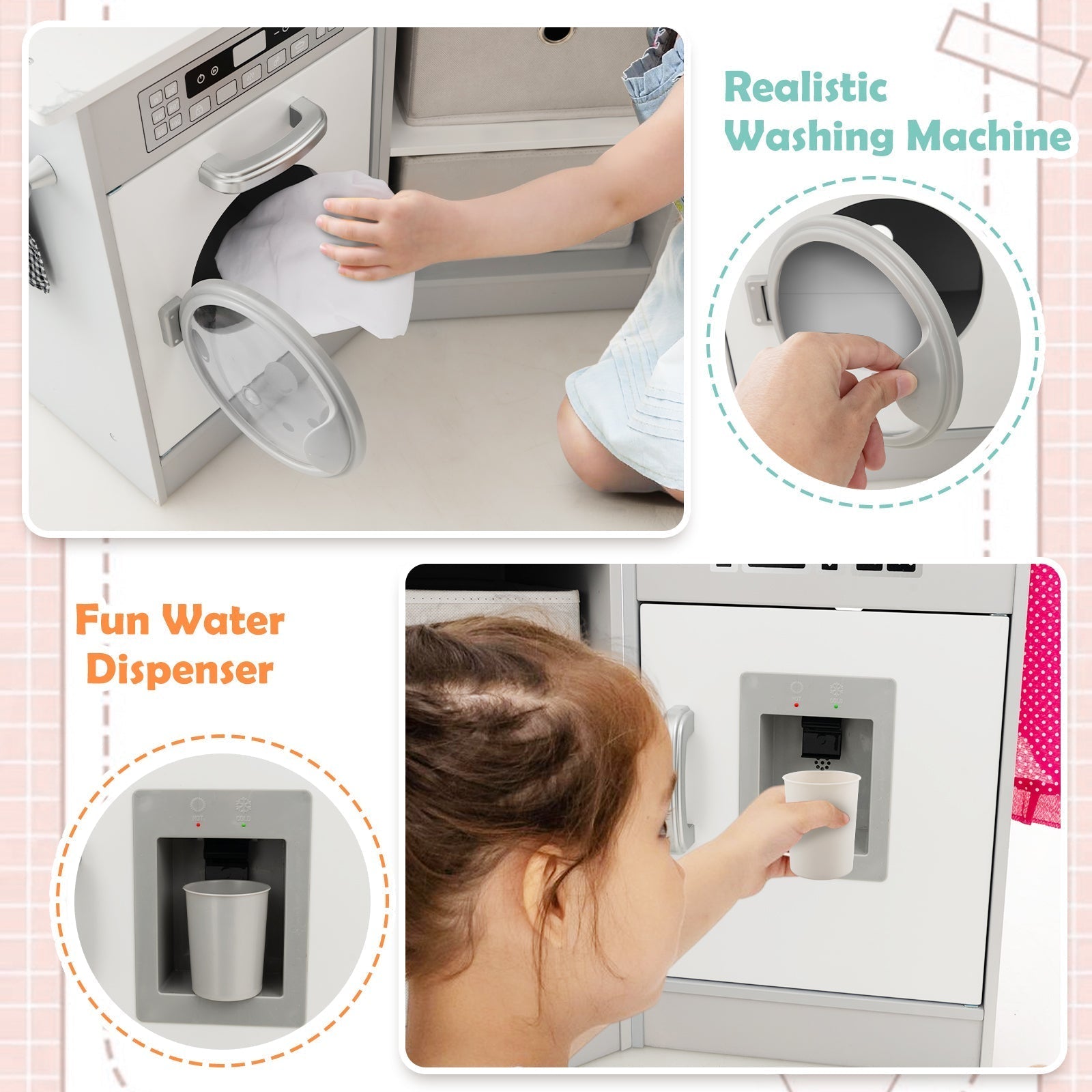 '-Great gift for your little chef aged over 3 years old-Nice for kid's imagination, creativity, coordination and hands-on ability-Able to promote parent-child interaction-Lighted range hood, lighted stovetop and microwave offer an immersive experience-The faucet and sink has an automatic water circulation-The water dispenser and washing machine bring extra fun-Comes with rich cooking accessories, such as 1 chef hat, 1 apron, 1 rag, 1 pan, 1 pot with lid, 1 cutting board and knife, 2 cups, 3 kitchen utensils and 4 cutting vegetables-Approved by ASTM and CPSIA for high safety and durability-Burr-free and round corners protect kid's delicate skin-Suitable for kid's room, nursery, living room, kindergarten and playroom
