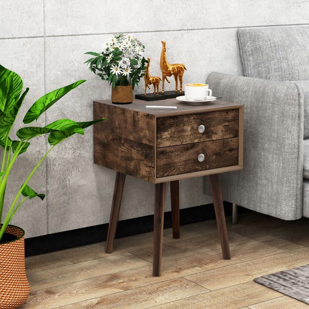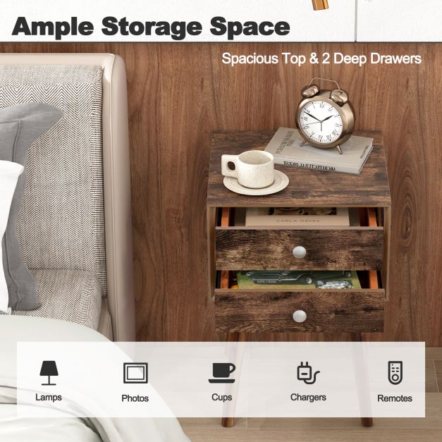 Wooden Nightstand with 2 Storage Drawers and Rubber Wood Legs-Rustic Brown