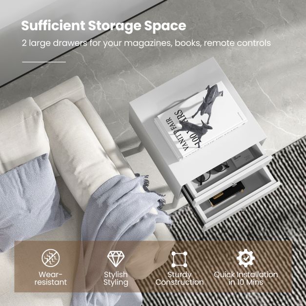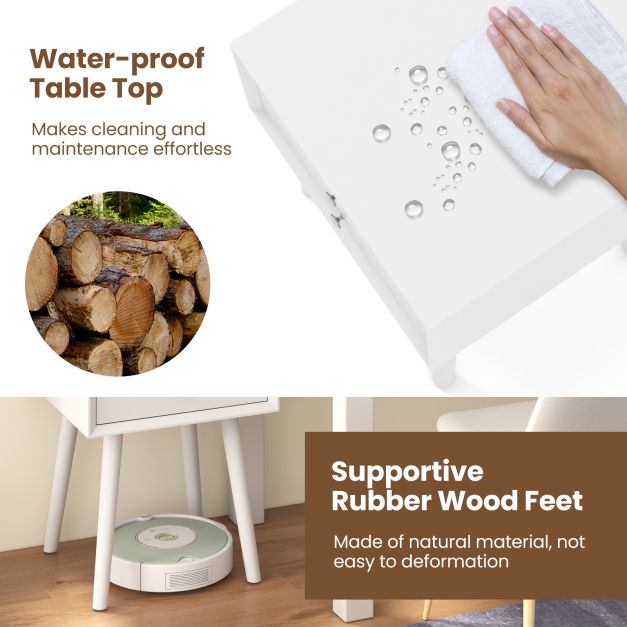 Wooden Nightstand with 2 Storage Drawers and Rubber Wood Legs-White
