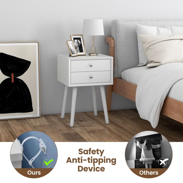 This versatile and stylish piece perfectly complements any decoration whether you're into modern, farmhouse, or vintage vibes. With 2 spacious drawers and a roomy top, you’ll have plenty of space for your bedside essentials like lamps, photos, cups, phones, and personal items. Crafted with solid rubber wood legs, this nightstand provides unmatched durability and support. Enhanced stability and safety are guaranteed with the anti-tipping device. It is perfect for any room, and an absolute must-have if you want to give your bedroom a make-over! Ample Storage Space: Equipped with 2 drawers, thebedside table allows you to arrange your household items and keep them neat and organized. Through the handles, the drawers can be easily pulled in or out. Besides, the spacious table top is ideal for you to display photo frame or personalized decoration. Tilting Prevention Device: Thewooden nightstand is equipped with tilting prevention device, which can tightly fasten the table to the wall. You no longer have to worry about the danger of accidental falls. And thanks to the high standard edge connecting procedure, this end table becomes more durable and solid. A Combination of Fashion and Function: Designed with the mid-century modern style, this 2-drawer side table will add a sense of chic aesthetics to your home. This small nightstand is perfect for you to put lamps, books or plants and is suitable for various places such as living room, bedroom or sofa side. Stable and Durable Structure: Made of rubber wood and MDF material, this bedside cabinet is solid and durable enough to support a long service life. 4 splayed round legs are made from solid wood, which support the whole structure stably. And the sleek and sturdy surface enhances the durability. Easy to Assemble: Coming with all the necessary accessories and hardware, this sofa side table is easy and quick to assemble. Every screw and pin has its own code and it's easy to understand the assemble progress. You can start and complete in a short time by following the instruction step by step.